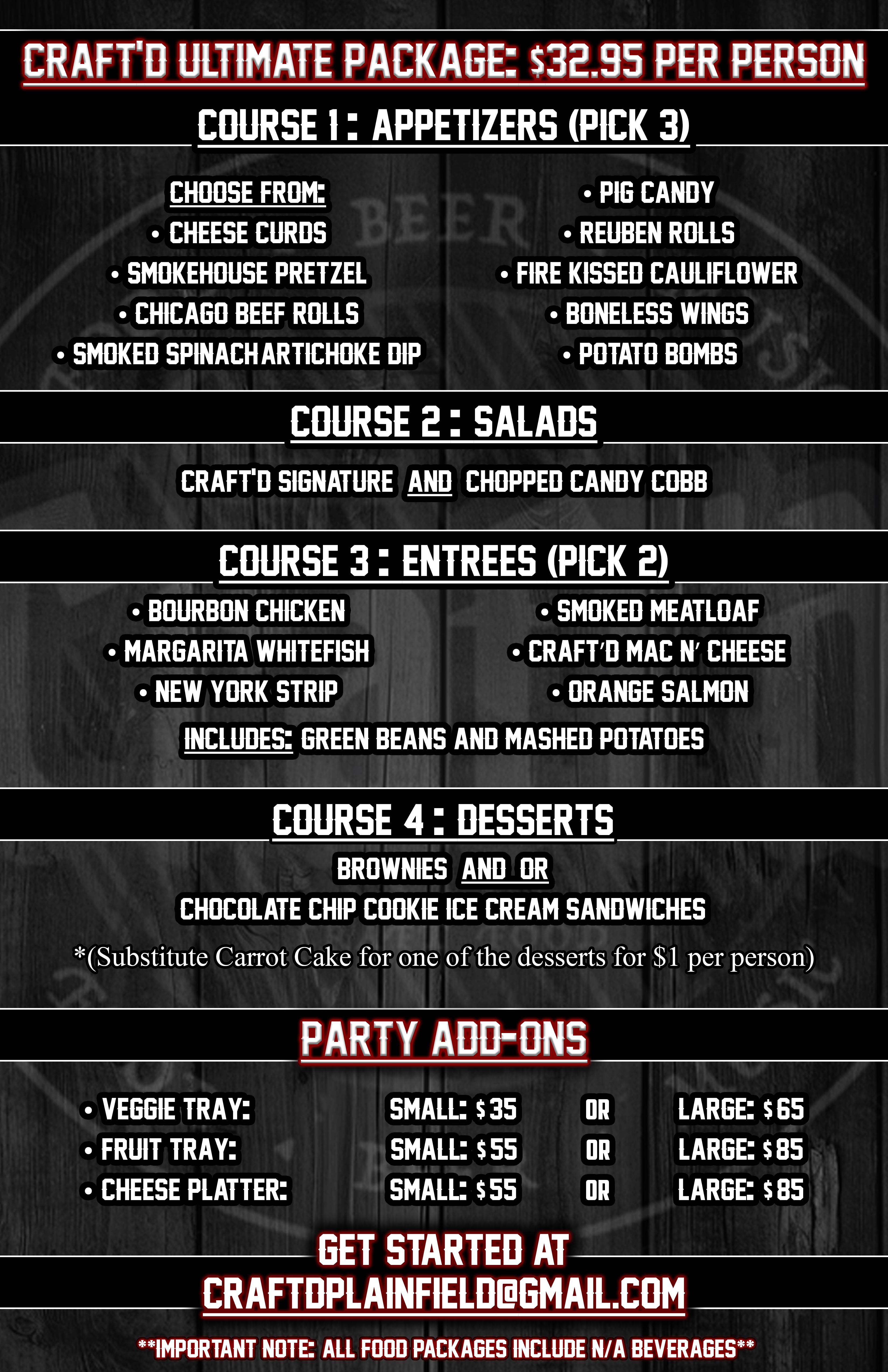 Course 1: Appetizers (Pick 3) - Cheese Curds - Smokehouse Pretzel - Chicago Beef Rolls - Smoked Spinach Artichoke Dip - Pig Candy - Reuben Rolls - Fire Kissed Cauliflower - Boneless Wings - Potato Bombs Course 2: Salads Craft'd Signature Salad and Chopped Candy Cobb Salad Course 3: Entrees (Pick 2) - Bourbon Chicken - Margarita Whitefish - New York Strip - Smoked Meatloaf - Craft'd Mac N' Cheese - Orange Salmon Includes Green Beans and Mashed Potatoes Course 4: Desserts Brownie and/or Chocolate Chip Ice Cream Sandwiches *Substitute Carrot Cake for one of the desserts for $1 per person Party Add-Ons: Veggie Tray - $35 Small or $65 Large Fruit Tray - $35 Small or $85 Large Cheese Platter - $55 Small or $85 Large