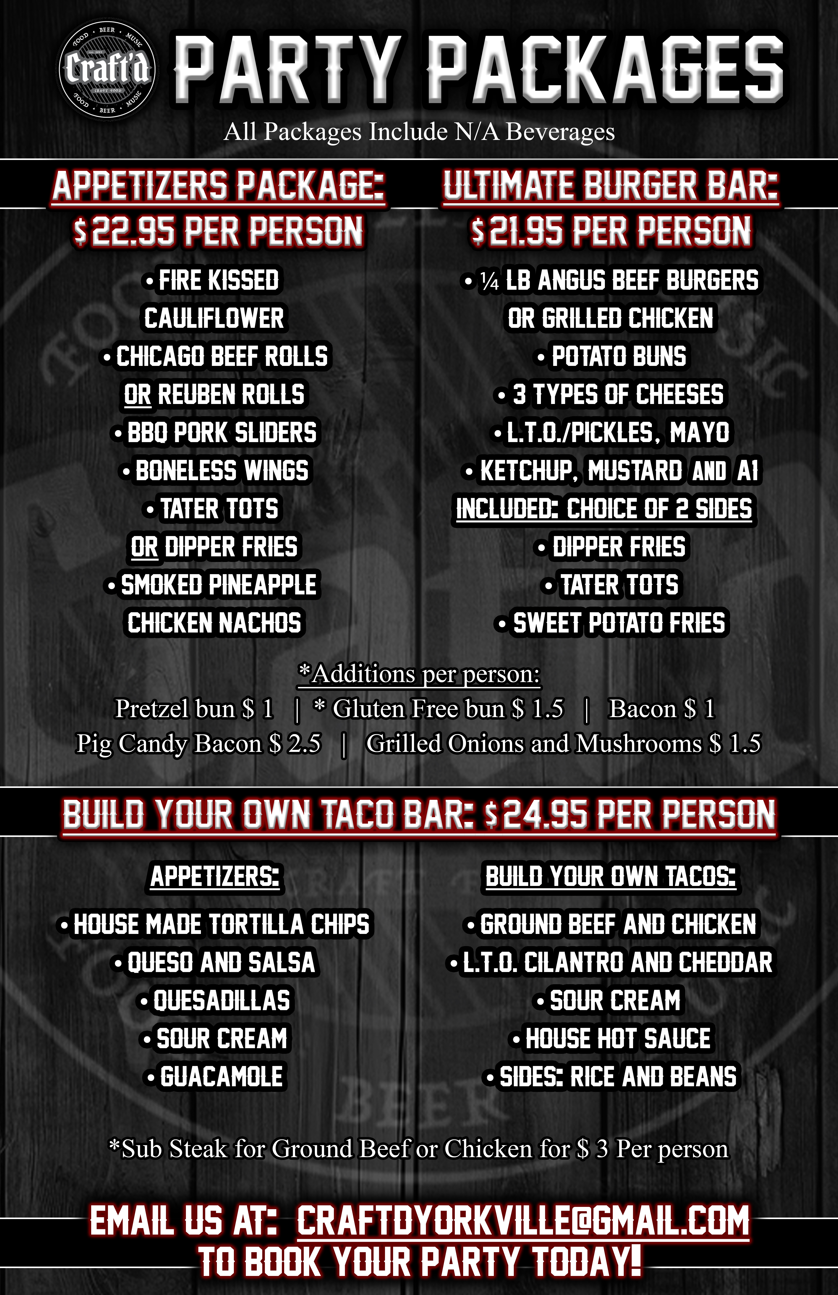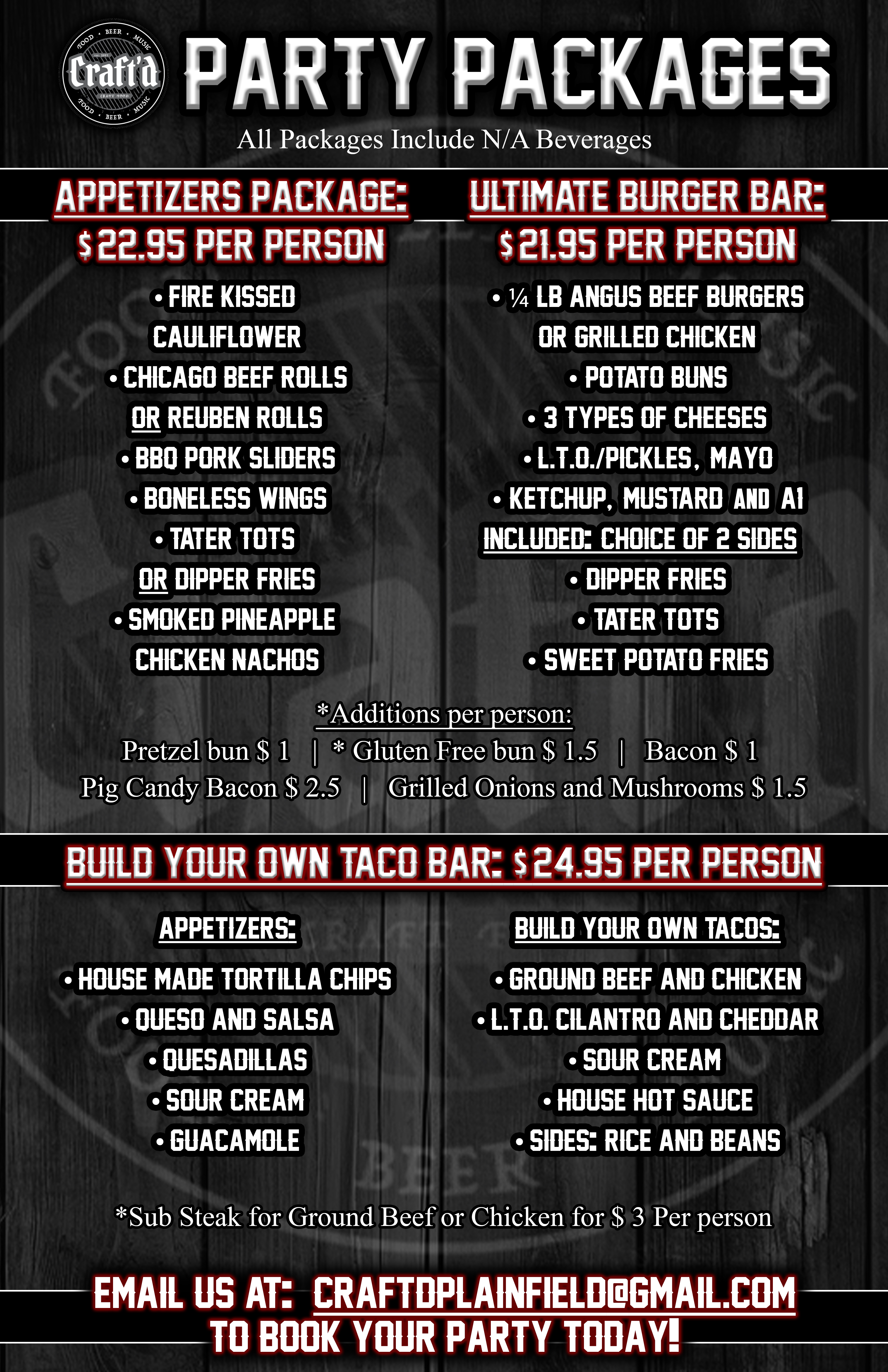 - Fire Kissed Cauliflower - Chicago Beef Rolls or Reuben Rolls - BBQ Pork Sliders - Boneless Wings - Tater Tots OR Dipper Fries - Smoked Pineapple Chicken Nachos *Additions - Pretzel Bun - $1 Additional - Gluten Free Bun - $1.5 Additional - Bacon - $1 Additional - Pig Candy Bacon - $2.5 Additional - Grilled Onions and Mushrooms - $1.5 Additional **All Packages Include N/A Beverages**