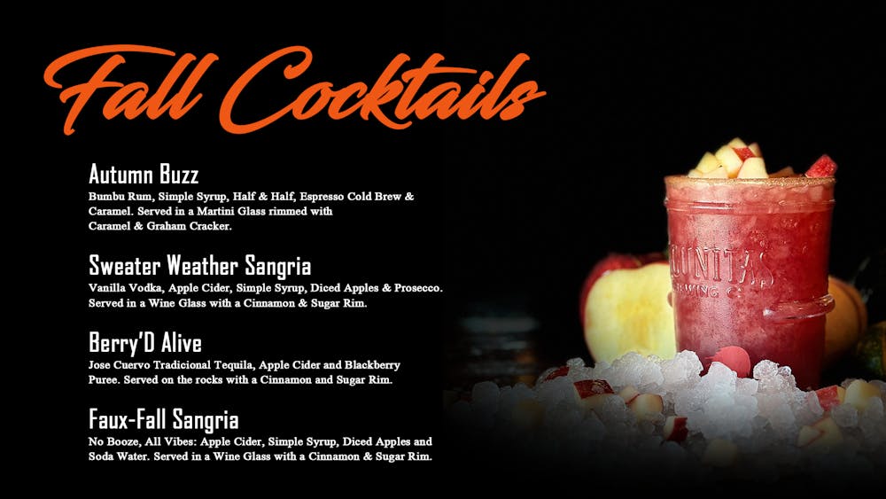 Jose Cuervo Tradicional Tequila, Apple Cider and Blackberry Puree. Served on the rocks with a Cinnamon and Sugar Rim.